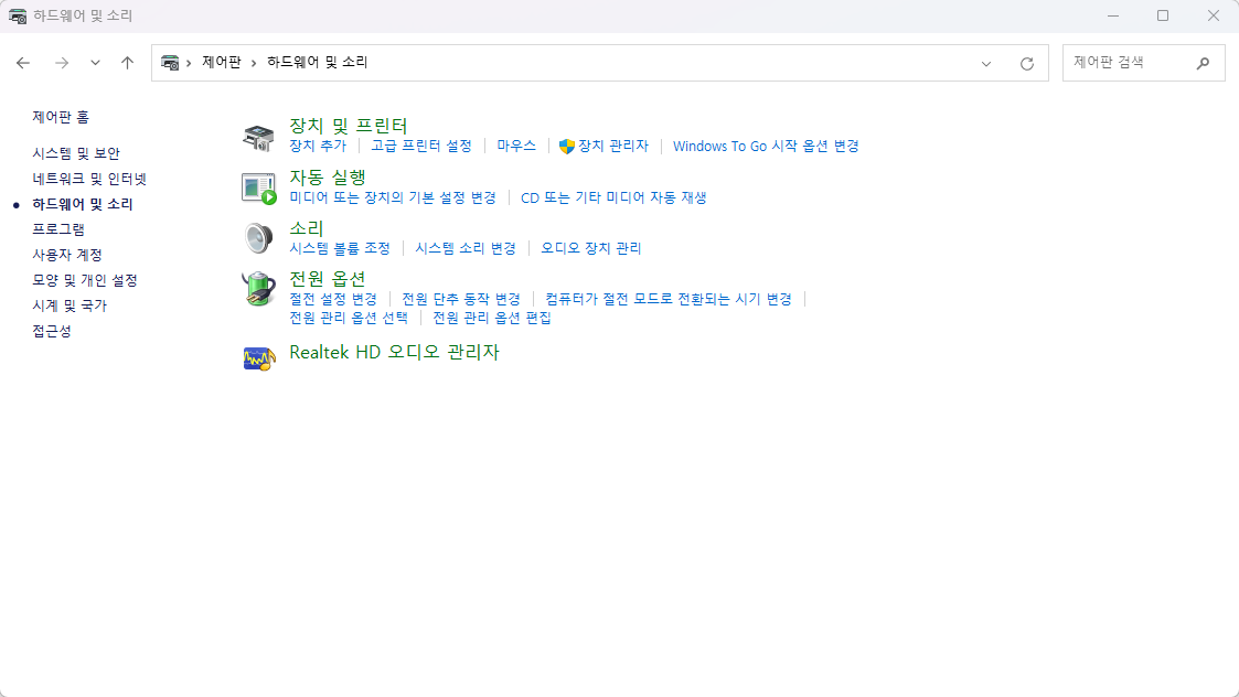 하드웨어 및 소리 창으로 이동되면 이렇게 여러 가지 옵션들이 보일 겁니다.