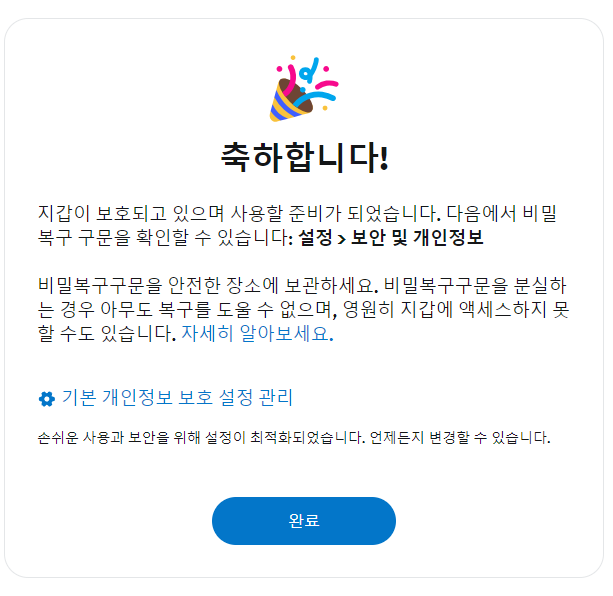 그리고 해당 비밀복구구문을 여러 군데에 메모해두시면 되겠습니다.