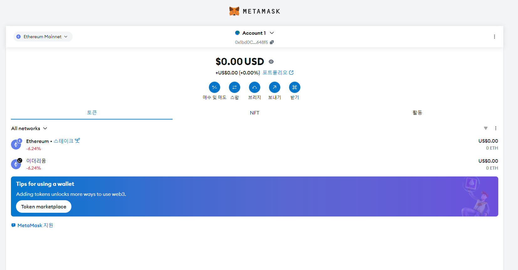 이렇게 해서 비트코인, 이더리움 등을 소지할 수 있는 가상지갑인 메타마스크 사용법에 대해 알아보았습니다.