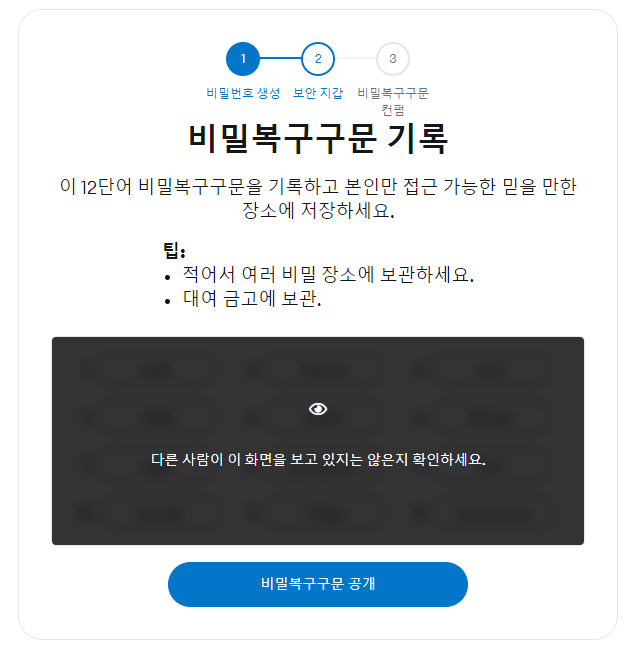 해당 비밀복구구문을 재확인하기도 하니, 꼭 다른 데에 메모해두시길 바랍니다.