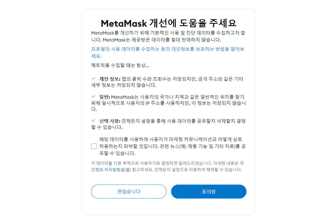 일단 'MetaMask의 이용약관에 동의합니다' 체크박스에 체크하도록 합시다.