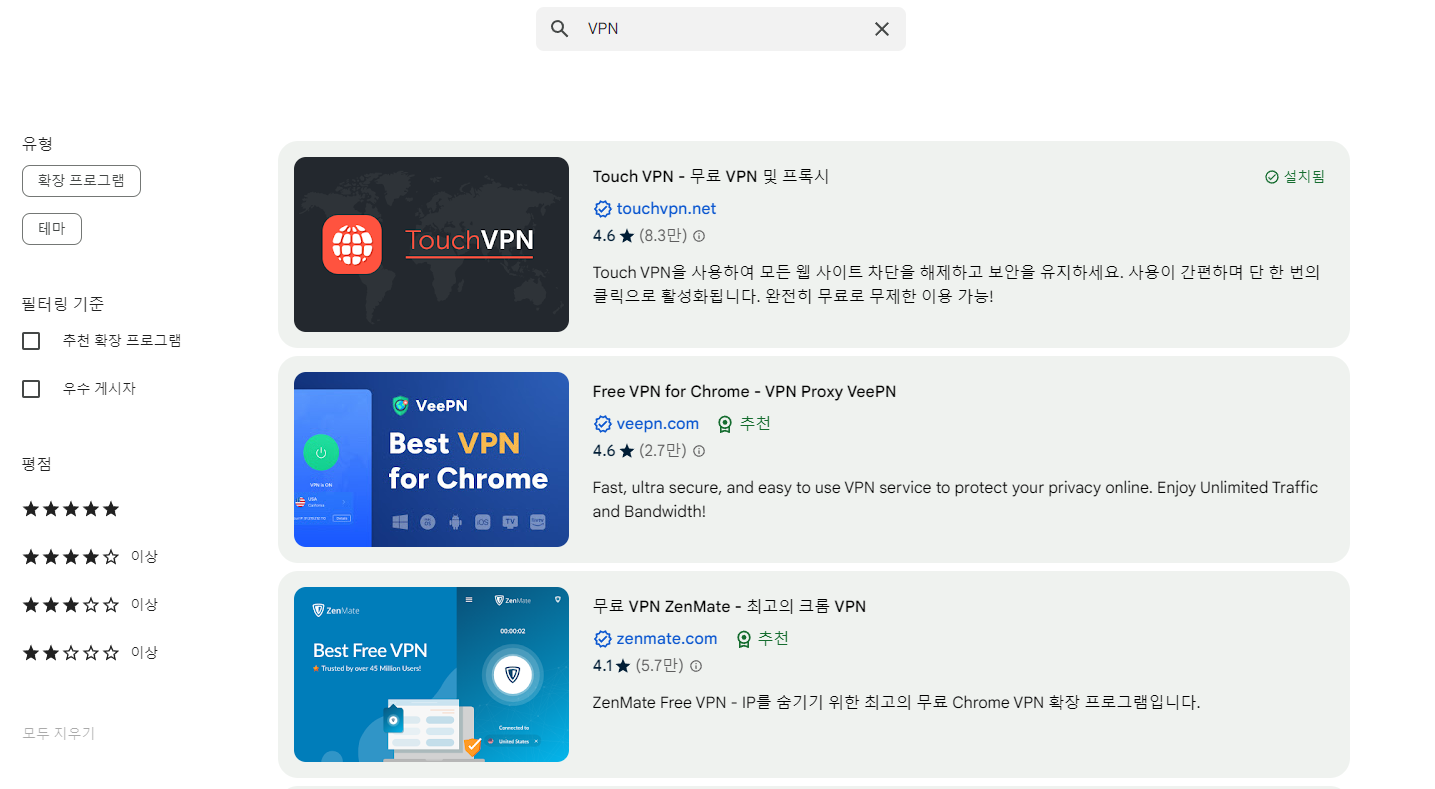 이렇게 크롬 웹스토어에서 VPN을 검색하면 여러 가지 프로그램들이 나옵니다.
