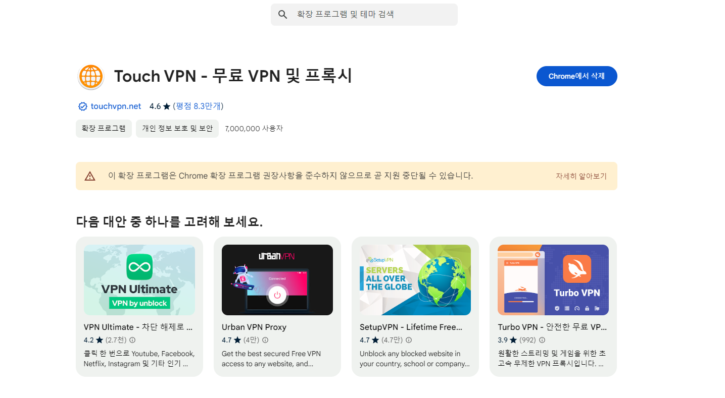 필자는 개인적으로 순간적으로 빠르게 VPN할 수 있는 크롬 웹스토어를 추천합니다.