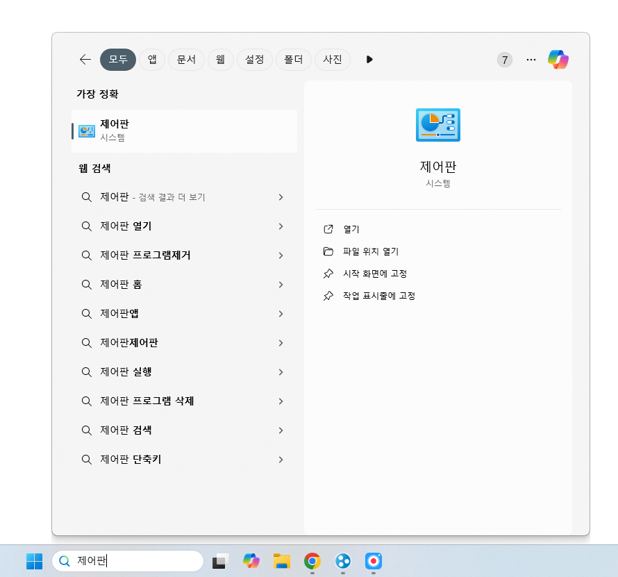 우선 화면 하단의 윈도우 검색창에 '제어판'을 입력해서 검색해주세요.