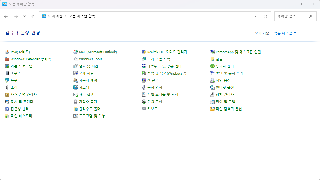 실행된 제어판 창에서 우측 상단의 '보기 기준'을 '작은 아이콘'으로 설정해주세요.