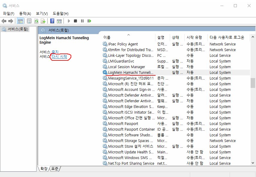 해당 서비스를 클릭하고 좌측의 '서비스 다시 시작' 버튼을 클릭해주세요.