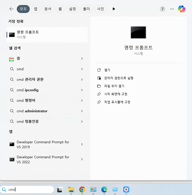 우선 컴퓨터 화면 하단에 보이는 윈도우 검색창에 '명령 프롬프트' 또는 'CMD'라고 입력해서 명령 프롬프트를 실행해줍시다. 관리자 권한이 아닌 기본 실행을 해주세요.