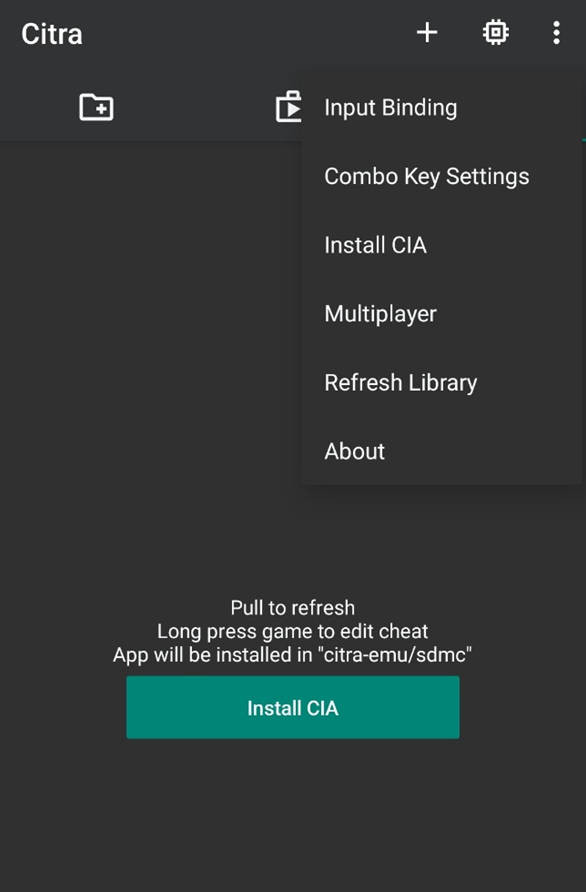 그리고 우측 상단에 이렇게 옵션창이 있습니다. 그걸 탭하면 이렇게 나오는데, Install CIA를 탭해봅시다.