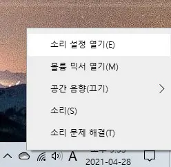그리고 모니터 화면 우측 하단에 있는 스피커 아이콘을 우클릭해 보도록 합시다. 그리고 그중에서 '소리 설정 열기(E)'를 클릭해 주세요.