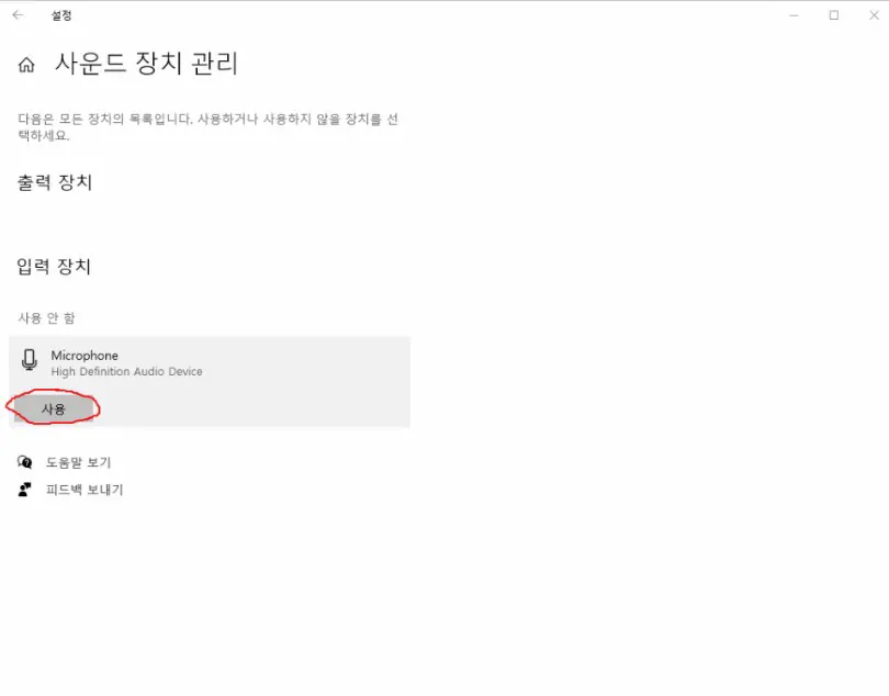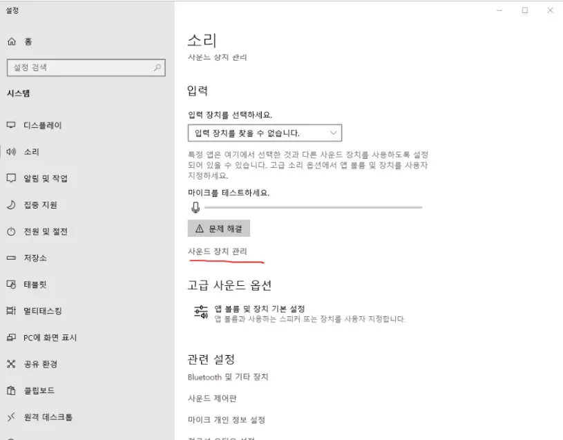 만약, 이렇게 해도 입력 장치가 안 나타나고, 음성 입력이 안된다면, '사운드 장치 관리'를 클릭해 주세요.
