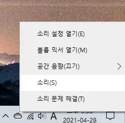 우측 하단의 스피커 아이콘을 우클릭하고, 이번엔 나오는 탭들 중에서 '소리(S)'를 클릭하세요.