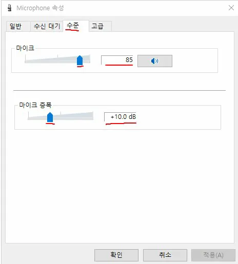 그러면, 창이 하나 나올 텐데, 위의 바에서 '수준'을 클릭하면 위의 창처럼 마이크에 관해서 설정을 할 수 있습니다.