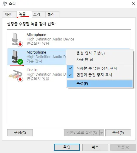 위의 항목 바 중에서 '녹음'을 클릭하고, 현재 쓰고 있는 마이크 기능인 '기본 장치'에 우클릭을 해주세요.