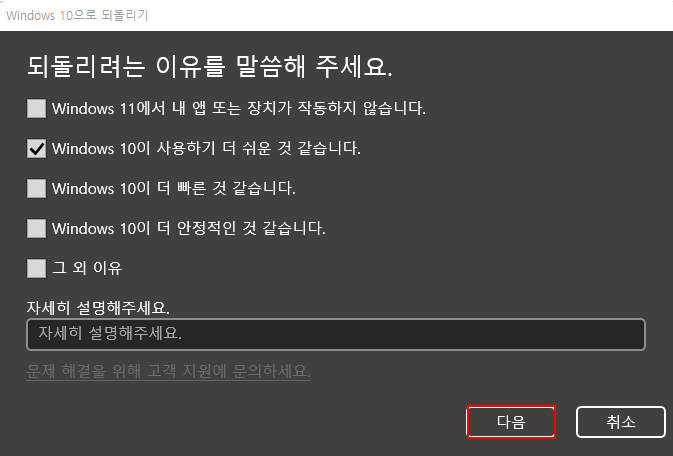 돌아가기를 클릭하면 Windows 10으로 되돌리기 창이 나타납니다.