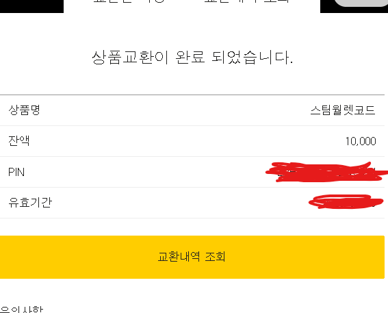 그럼 상품교환이 완료 되었다는 창이 뜨며 pin 번호가 발급됩니다. 그 pin 번호를 복사합니다.