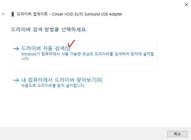 ○ 드라이버 업데이트 창에서 첫 번째 선택 목록에 있는 "드라이버 자동 검색(S)"를 클릭합니다.