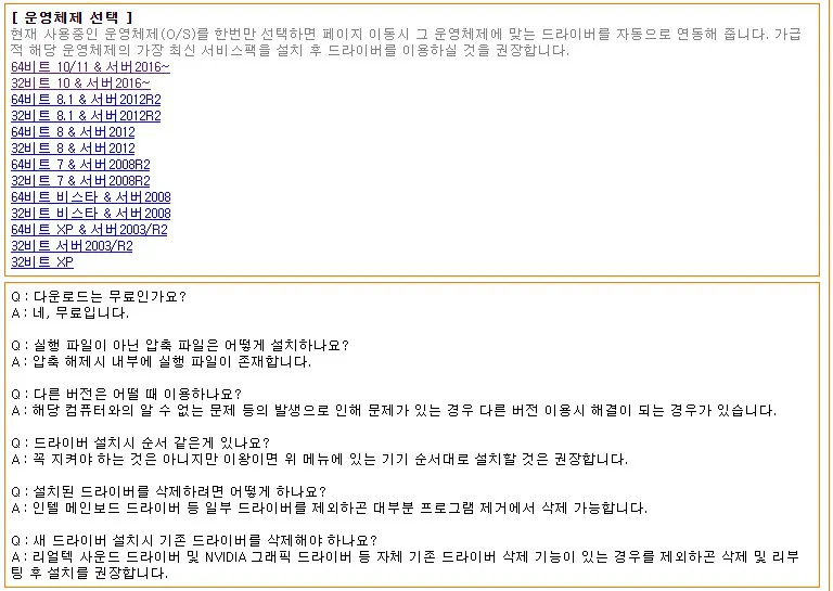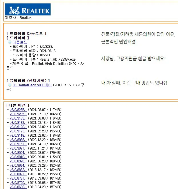 여기서 다운로드하는 드라이버는 리얼텍입니다. 또 다른 방법으로는 사용자의 사운드 카드를 확인하여 해당 제조사에서 자동으로 받아주는 3d chip 프로그램을 이용하는 겁니다. 설명이 길어지기 때문에 아래 글에서 참조하시면 되겠습니다.
